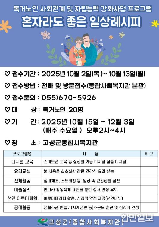 한민일보 서울포커스 김은금 기자 | 고성군은 10월 2일부터 13일까지 고성군종합사회복지관에서 독거노인 어르신을 대상으로 독거노인 자립 및 사회관계 형성 프로그램 ‘혼자라도 좋은 일상레시피’ 참여자를 모집한다.