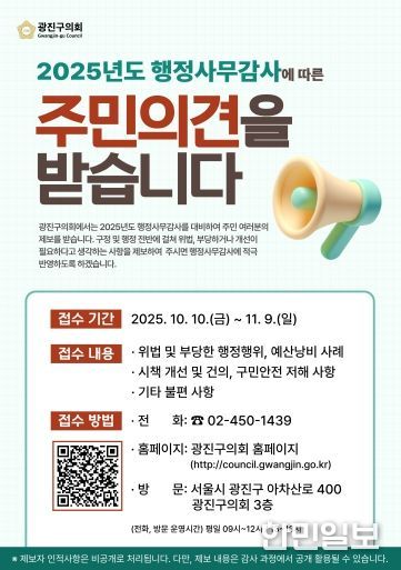 한민일보 서울포커스 국용호 기자 | 광진구의회가 오는 11월 17일부터 진행되는 ‘2025년도 행정사무감사’를 앞두고 주민 의견을 10월 10일부터 11월 9일까지 총 31일간 접수한다.