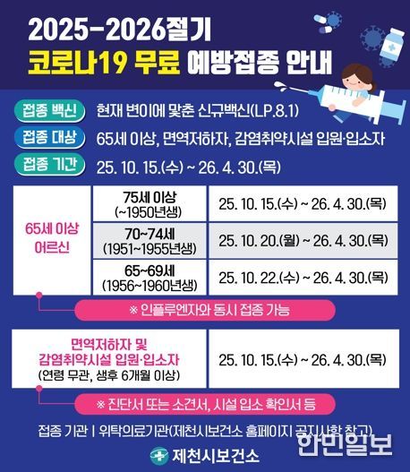 한민일보 서울포커스 김다남 기자 | 제천시는 오는 15일부터 65세 이상 어르신, 생후 6개월 이상 면역저하자, 감염취약시설 입원․입소자를 대상으로 신규 코로나 백신(LP.8.1)을 활용해 코로나19 무료 예방접종을 실시한다.