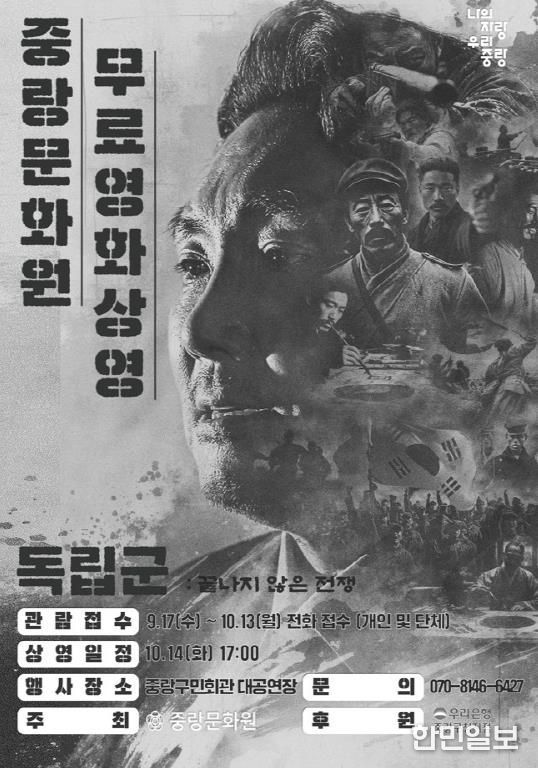 한민일보 서울포커스 임광현 기자 | 중랑구는 오는 10월 14일 오후 3시와 5시, 중랑구민회관 대공연장에서 광복 80주년을 기념하는 영화 ‘독립군’을 상영한다. 이번 상영회는 중랑문화원이 주최해 선열들의 희생과 숭고한 뜻을 되새기는 특별한 자리로 마련됐다.