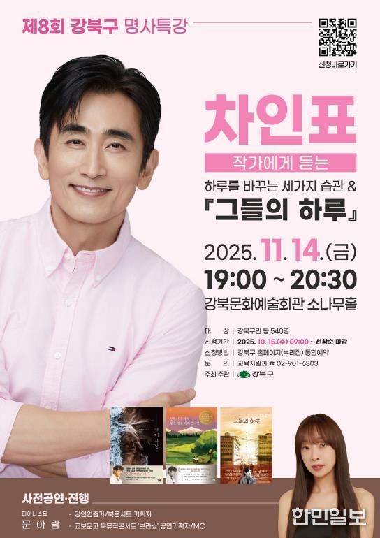 한민일보 서울포커스 김봉순 기자 | 서울 강북구는 오는 11월 14일 오후 7시 강북문화예술회관 강북소나무홀에서 배우이자 작가로 활동 중인 차인표 작가를 초청해 ‘제8회 강북구 명사특강’을 개최한다.