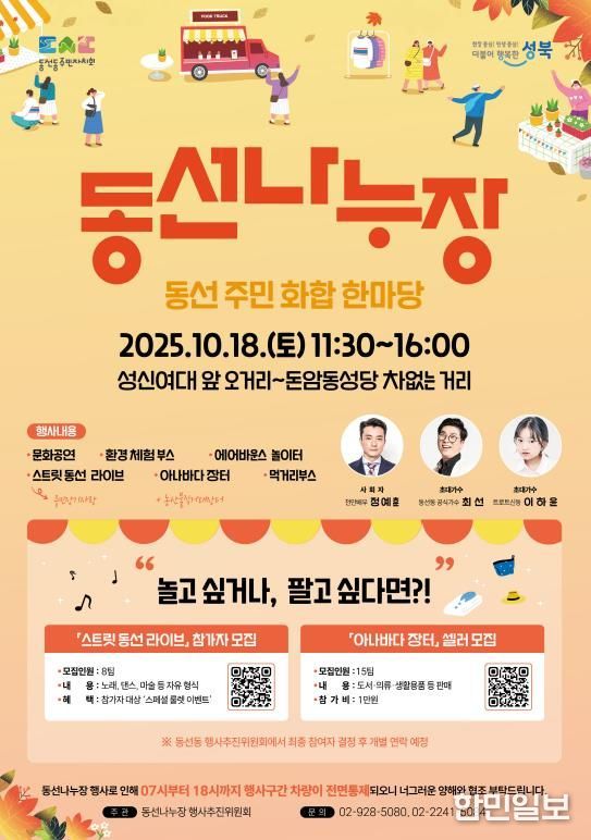 한민일보 서울포커스 김봉순 기자 | 서울 성북구가 오는 10월 18일 오전 11시 30분부터 오후 4시까지 성신여대 앞 오거리에서 돈암동성당 구간까지 이어지는 도로에서 ‘2025년 차 없는 거리 동선나누장’을 개최한다.