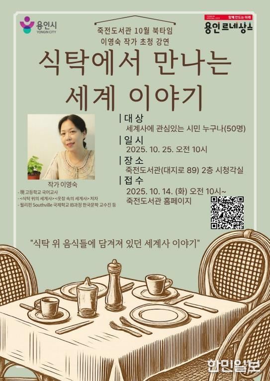한민일보 서울포커스 김성윤 기자 | 용인특례시는 25일 오전 10시 죽전도서관 시청각실에서 죽전도서관 북타임 작가초청강연회 ‘식탁에서 만나는 세계 이야기’를 연다고 13일 밝혔다.
