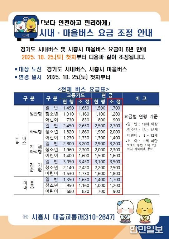 한민일보 서울포커스 유현민 기자 | 시흥시는 오는 10월 25일 첫차부터 경기도 시내버스 및 시흥시 마을버스 요금을 조정한다.