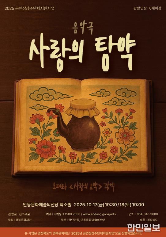올해 선정된 상주단체 ‘극단안동’은 한국적 소재를 바탕으로 연극과 뮤지컬, 음악극, 거리 퍼포먼스 등 다양한 장르를 넘나들며 활발한 창작 활동을 이어가고 있다. 창작 음악극 '사랑의 탕약'은 10월 17일 오후 7시 30분과 18일 오후 7시, 양일에 걸쳐 안동문화예술의전당 백조홀 무대에서 열린다.