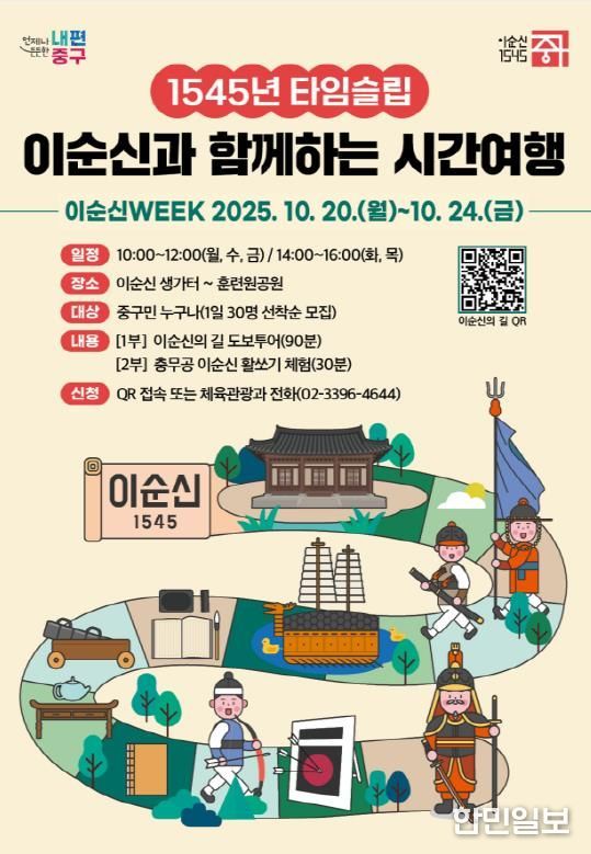 한민일보 서울포커스 김서윤 기자 | 충무공 이순신의 고향, 서울 중구가 이순신 장군의 발자취를 따라 걷는 도보투어와 무예 정신을 되살리는 활쏘기 체험 프로그램을 오는 10월 20일부터 24일까지 운영한다.
