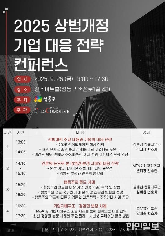 한민일보 서울포커스 임광현 기자 | 서울 성동구는 지난달 26일 성수타운매니지먼트(Seongsu Town Management) 사업의 일환으로 진행된 '2025 상법개정과 기업의 대응전략' 컨퍼런스를 성공적으로 마쳤다고 밝혔다.