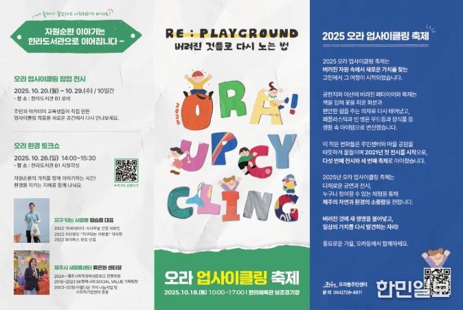 한민일보 서울포커스 김다남 기자 | 제주시 오라동은 10월 18일 오전 10시 한라체육관 보조경기장 일원에서 ‘2025 오라업사이클링축제’를 개최한다.