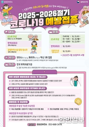 한민일보 서울포커스 임광현 기자 | 달성군은 오는 10월 15일부터 2026년 4월 30일까지 ‘2025-2026절기 코로나19 예방접종’을 실시한다고 밝혔다.