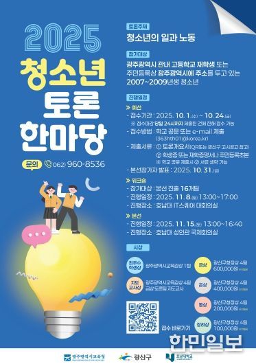 한민일보 서울포커스 박용남 기자 | 광주 광산구가 청소년들의 다양한 시각에서 생각하고 소통하는 ‘2025 광산 청소년 토론한마당’을 개최한다.