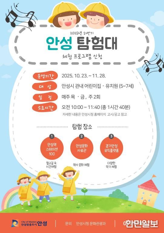 한민일보 서울포커스 임경복 기자 | 안성시는 상반기에 시범 운영해 큰 호응을 얻은 유아 대상 체험형 프로그램 ‘안성 탐험대: 역사 속으로, 음악 속으로!’를 하반기에도 운영하며, 지역 문화시설 활성화에 나선다.