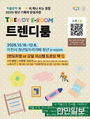▲오일파스텔 드로잉 ▲핸드위빙으로 구성하여 예술 작품 제작 및 전시를 준비 및 운영함으로써 문화 기획과 창작 역량을 동시에 강화하는 본 과정은 19세 이상 39세 이하 관내 청년이면 누구나 10월 13일부터 큐알(QR)코드를 통해 신청할 수 있다.