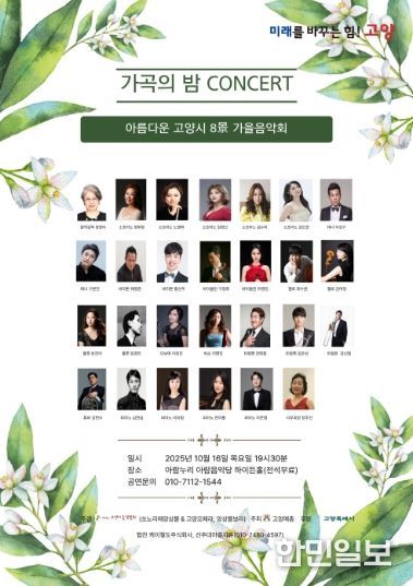 한민일보 서울포커스 김은금 기자 | 고양특례시가 후원하고, (사)한국예술문화단체총연합회 고양지회가 주최하며 (사)한국음악협회 고양지부가 주관하는 ‘2025 가곡의 밤 – 아름다운 고양시 8경(景) 가을 음악회’가 오는 16일 오후 7시 30분, 고양아람누리 아람음악당에서 개최된다.