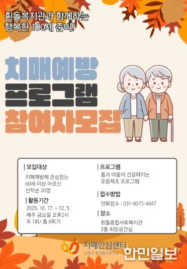 한민일보 서울포커스 김은금 기자 | 고양특례시 일산동구보건소 치매안심센터는 치매안심마을로 지정된 백석2동 흰돌복지관에서 운영되는 치매예방교실‘기억안심, 웃음활짝’의 참가자를 모집한다고 밝혔다.