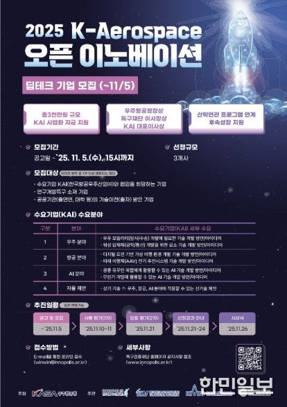 한민일보 서울포커스 기자 | 우주항공청은 10월 13일 우주항공청이 주최하고 한국항공우주산업㈜, 연구개발특구진흥재단, 진주강소특구(경상대학교), 한국항공우주연구원이 주관하는 '2025 K-Aerospace 오픈 이노베이션'을 추진하여 딥테크 기업을 육성할 계획이라고 밝혔다.