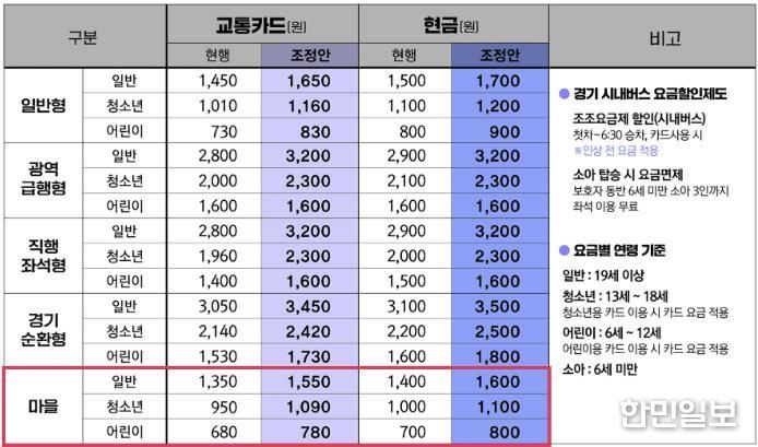 그 결과 교통카드 기준 △일반 시내버스 요금은 성인 1450원→1650원, 청소년 1010원→1160원, 어린이 730원→830원 △직행좌석형과 광역급행형(M) 버스는 성인 2800원→3200원, 청소년 1960원→2300원, 어린이 1400원→1600원 △경기순환형 버스는 성인 3050원→3450원, 청소년 2140원→2420원, 어린이 1530원→1730원 △마을버스 요금은 성인 1350원→1550원, 청소년 950원→1090원, 어린이 680원→780원으로 각각 인상된다.