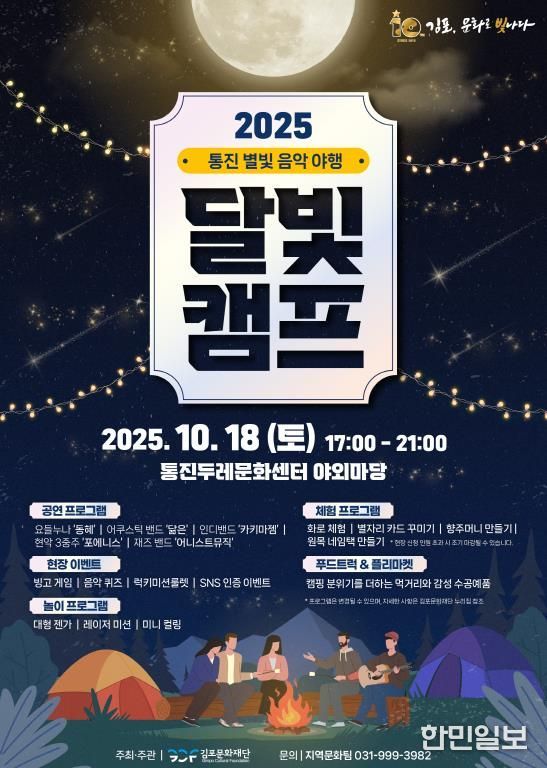 한민일보 서울포커스 김용택 기자 | (재)김포문화재단이 주관하는 2025 통진별빛음악야행 '달빛캠프'가 10월 18일 17시부터 통진두레문화센터 야외마당에서 개최된다.