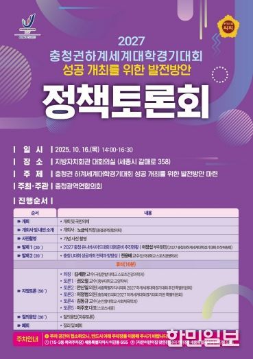 한민일보 서울포커스 곽동근 기자 | 충청광역연합의회는 오는 16일 2027년 충청권 하계세계대학경기대회의 성공적인 개최를 위한 발전 방안을 모색하기 위해 토론의 장을 마련한다.
