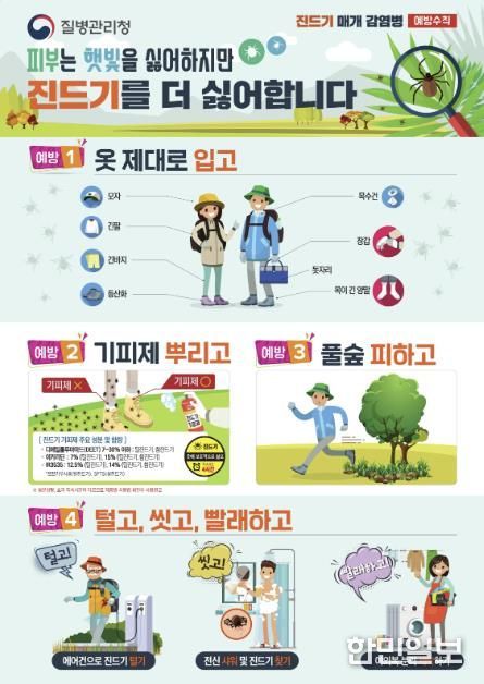 진드기 매개 감염병 예방을 위해서는 ▲야외 활동 시 진드기 기피제 사용 및 긴소매·긴바지·모자 등 착용으로 피부 노출 최소화 ▲야외활동 후 즉시 샤워 및 옷 갈아입기 ▲얼굴, 귀, 몸통 등에 진드기 부착 여부 확인 등의 수칙을 지켜야 한다.