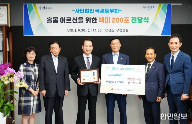 한민일보 서울포커스 김봉순 기자 | 서울 성북구가 지난 9월 30일 백미 800㎏(4㎏들이 200포)을 기부한 (사)국세동우회 자원봉사단(단장 정환만)에게 감사장을 수여하며 나눔의 자리를 가졌다.