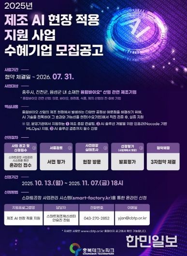 한민일보 서울포커스 임경복 기자 | 충북도는 오는 11월 7일까지 도내 주력산업인 융합바이오 산업과 인공지능(AI) 기술의 융합 촉진을 위한 ‘제조 AI 현장 적용 지원사업’의 참여기업을 모집한다고 14일 밝혔다.
