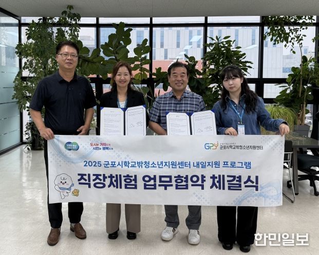 한민일보 서울포커스 임경복 기자 | 군포시청소년재단(대표이사 김덕희), 군포시학교밖청소년지원센터(센터장 강연미)는 시각디자인 분야로의 진학과 진로를 희망하는 학교 밖 청소년을 지원하기 위해 관내 디자인 전문업체인 ㈜은진과 직장체험 업무협약을 체결했다고 밝혔다.