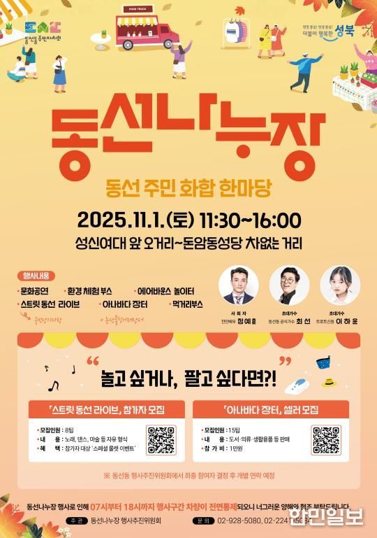 한민일보 서울포커스 김봉순 기자 | 서울 성북구는 오는 11월 1일 오전 11시 30분부터 오후 4시까지, 성신여대 앞 오거리에서 돈암동성당 구간까지 이어지는 거리에서 ‘2025년 차 없는 거리 동선나누장’ 행사를 개최한다고 밝혔다.