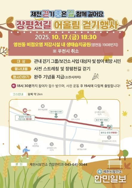 한민일보 서울포커스 김다남 기자 | 제천시보건소가 관내 걷기 그룹 활성화와 시민 건강 증진을 위한 장평천길 어울림 걷기 행사를 오는 17일 저녁 6시 30분에 개최한다고 밝혔다.