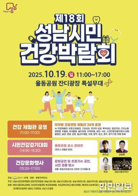 한민일보 서울포커스 김성혜 기자 | ‘제18회 성남시민 건강박람회’가 오는 10월 19일 오전 11시~오후 5시 율동공원 잔디광장에서 열린다.