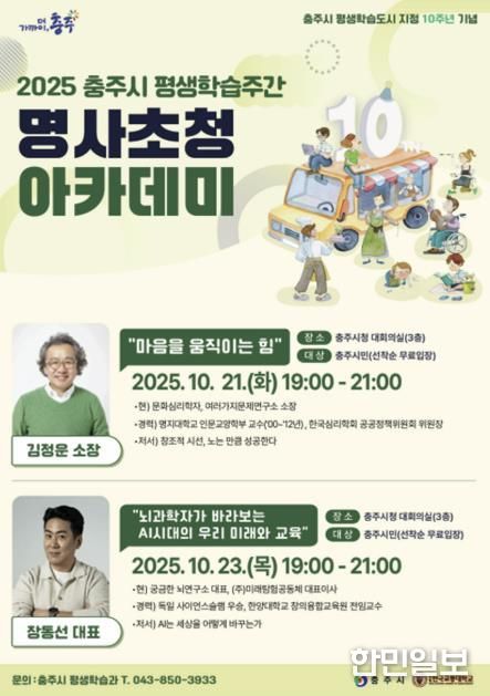 한민일보 서울포커스 김다남 기자 | 충주시는 '2025 충주시 평생학습주간'을 맞아 평생학습도시 지정 10주년을 기념하고자 시민과 함께하는 ‘명사초청 아카데미’를 오는 21일과 23일 오후 7시, 충주시청 대회의실에서 개최한다고 16일 밝혔다.