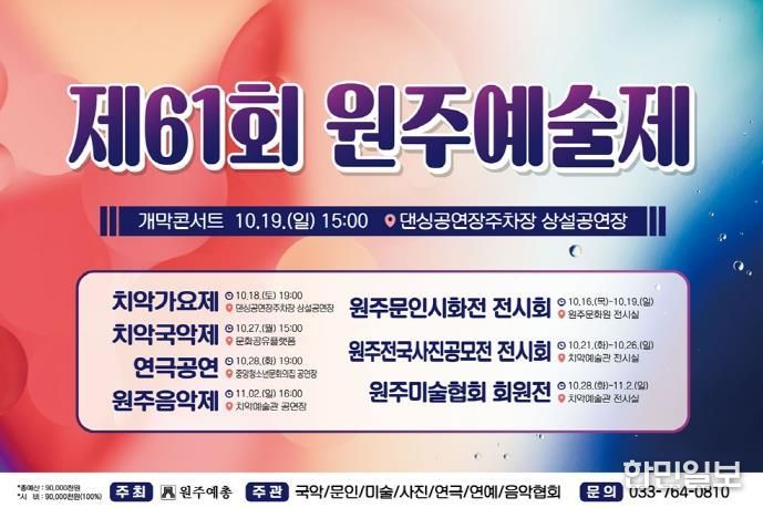 한민일보 서울포커스 임경복 기자 | (사)원주예총은 오는 10월 16일부터 11월 2일까지 원주시 댄싱공연장 주차장 상설공연장과 치악예술관 전시실 등 원주 전역에서 시민과 함께하는 ‘제61회 원주예술제’를 개최한다.