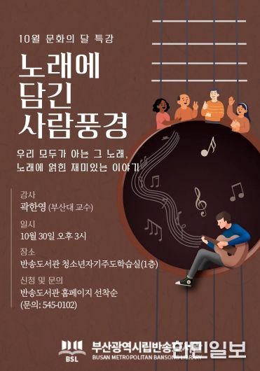 한민일보 서울포커스 임광현 기자 | 부산광역시립반송도서관(관장 송애경)은 오는 30일 도서관 청소년자기주도학습실에서 지역주민 30명을 대상으로 인문학 특강 ‘노래에 담긴 사람풍경’을 운영한다.