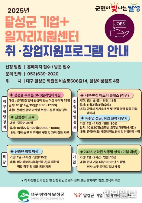 최재훈 달성군수는 “이번 프로그램이 구직자에게는 취·창업 기회를, 기업에는 인재 확보와 고용 환경 대응에 실질적인 도움이 되기를 기대한다”며 “앞으로도 수요자 중심의 다양한 지원 프로그램을 지속 추진하겠다”고 밝혔다.