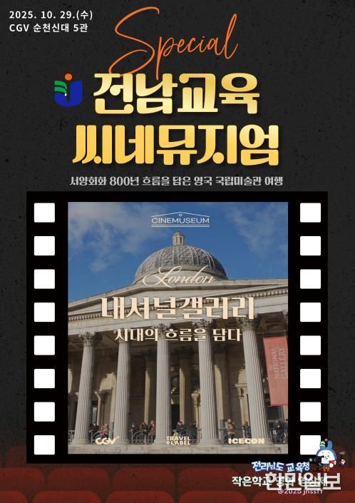 한민일보 서울포커스 임철현 기자 | 전라남도교육청은 오는 29일 CGV순천신대 5관에서 ‘전남교육씨네뮤지엄: 아트가이드와 함께하는 유럽 미술관 투어’ 프로그램을 운영한다.