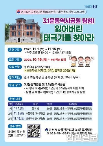 이번 프로그램은 초등학생과 중학생을 대상으로 독립운동 체험행사로 11월 1일부터 15일까지 매주 토요일(3기)까지 진행되며, 특히 10월 말 개관 예정인 군산선교역사관과 연계되어 운영될 예정이다.