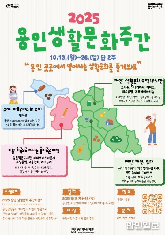 한민일보 서울포커스 김성윤 기자 | (재)용인문화재단은 시민 주도의 생활문화 확산을 위해 ‘2025 용인생활문화주간(10.13.~10.26.)’ 사업을 용인 곳곳에서 운영하고 있다.