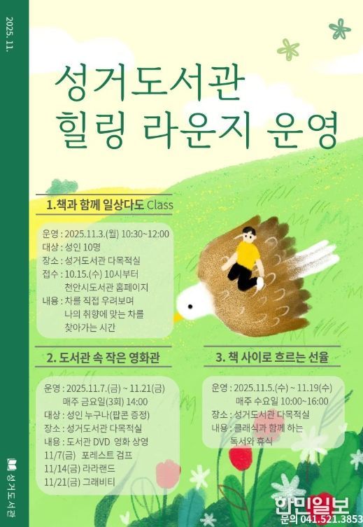 한민일보 서울포커스 황준형 기자 | 천안시 성거도서관은 내달 ‘힐링 라운지’ 프로그램을 운영한다고 17일 밝혔다.