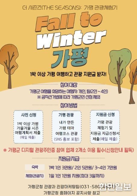 한민일보 서울포커스 최성훈 기자 | 가평군은 가을과 겨울철 지역관광 활성화를 위해 체류형 관광객에게 숙박비와 체험비를 지원하는 ‘더 시즌즈(The Seasons) 행사를 추진한다고 17일 밝혔다.