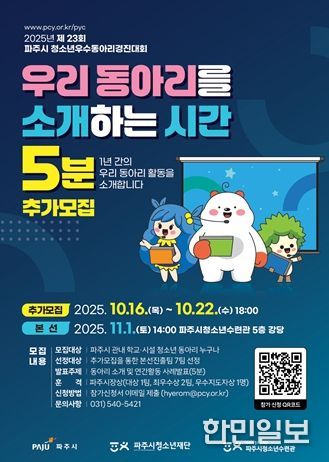 한민일보 서울포커스 진광성 기자 | (재)파주시청소년재단 파주시청소년수련관은 오는 10월 16일부터 10월 22일까지 “제23회 파주시 청소년우수동아리경진대회”의 참가 동아리를 모집한다.