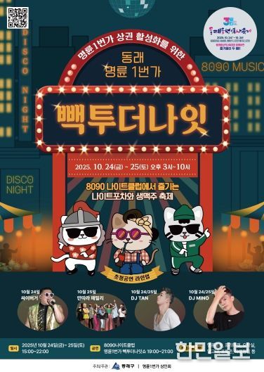 한민일보 서울포커스 임광현 기자 | 부산 동래구는 오는 10월 24일부터 25일까지 이틀간 오후 3시부터 10시까지 명륜1번가 일대에서 ‘명륜1번가 나이트 페스티벌(빽투더나잇)’을 개최한다고 밝혔다.
