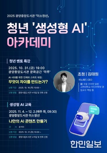 ‘청년 멘토 특강’은 10월 16일 오전 10시부터, ‘생성형 AI 교육’은 10월 21일 오전 10시부터 각각 선착순으로 접수하며, 광양시립도서관 누리집과 전화로 신청할 수 있다. 자세한 사항은 광양중앙도서관으로 문의하면 된다