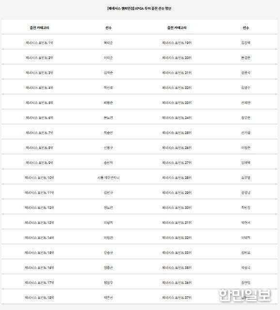 제네시스 포인트 1위 옥태훈(27.금강주택)을 비롯해 2위 이태훈(35.캐나다), 3위 김백준(24.속초아이), 4위 최진호(41.COWELL), 5위 배용준(25.CJ), 6위 문도엽(34.DB손해보험), 7위 최승빈(24.CJ), 8위 신용구(34.금강주택), 9위 송민혁(21.CJ), 10위 사돔 깨우깐자나(27.태국)까지 제네시스 포인트 TOP10 선수들과 36위 정한밀(34.경희), 37위 김동민(27.NH농협은행)까지 제네시스 포인트 상위 36명이 참가자 명단에 이름을 올렸다.