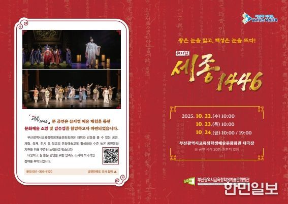 한민일보 서울포커스 임광현 기자 | 부산광역시교육청학생예술문화회관은 22일부터 24일까지 학생예술문화회관 대극장에서 초·중·고등학생과 교직원 및 동반가족 등 약 2,800여 명을 대상으로 뮤지컬 ‘세종 1446’ 공연을 개최한다.