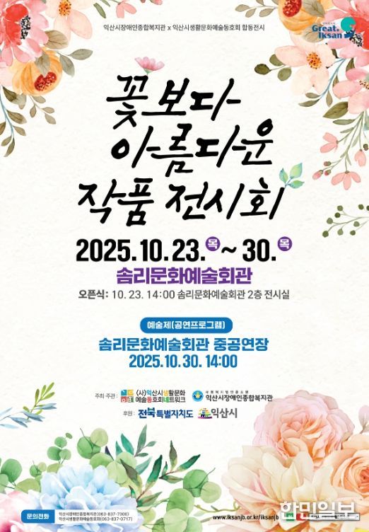 익산시는 오는 23일부터 30일까지 솜리문화예술회관 전시실에서 '2025 꽃보다 아름다운 작품전시회'가 열린다고 20일 밝혔다.