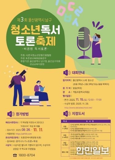 한민일보 서울포커스 기자 | 울산 남구는 청소년의 독서습관 형성과 건전한 토론문화 확산을 위해 오는 11월 15일 격동초등학교에서 개최하는‘2025년 제3회 울산광역시 남구 청소년 독서 토론축제’참가자를 모집한다고 밝혔다.