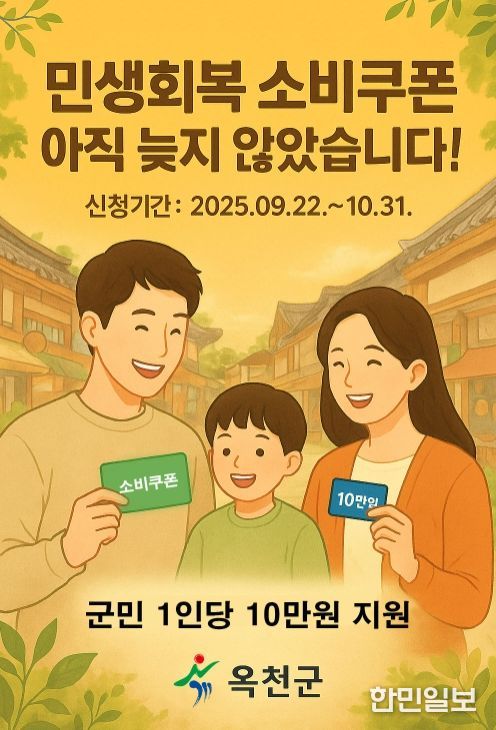 이번 2차 소비쿠폰은 소득 상위 10%를 제외한 모든 군민에게 1인당 10만원 씩 지급되며 신청은 오는 31일까지 본인 명의의 신용·체크카드, 옥천사랑상품권(향수OK카드)으로 신청 하면된다.