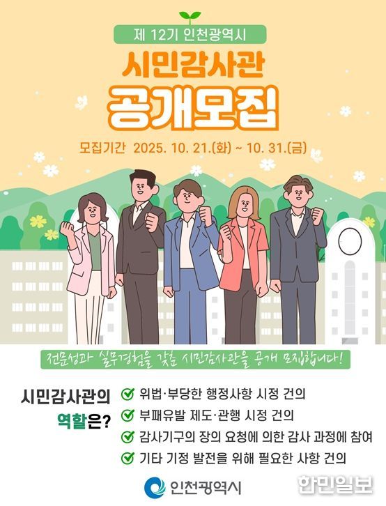 한민일보 서울포커스 유창렬 기자 | 인천광역시는 제12기 시민감사관을 10월 21일부터 10월 31일까지 공개모집한다고 밝혔다.