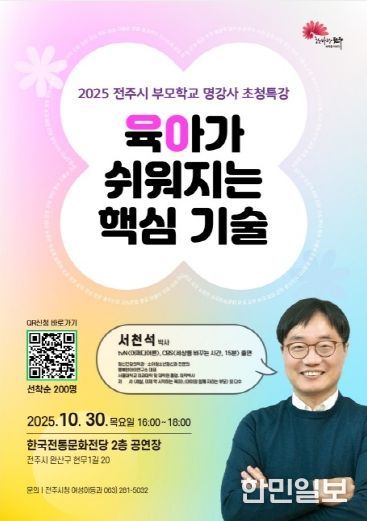이번 특강은 유아 및 초등학생 자녀를 둔 학부모 200명을 대상으로 무료로 진행되며, 참여를 원하는 학부모는 전주시 누리집 및 네이버폼(QR코드)을 통해 선착순 신청하면 된다.