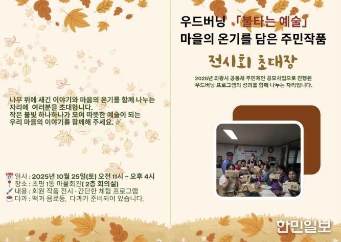 한민일보 서울포커스 전희주 기자 | 의왕시는 마을공동체 자강불식이 오는 10월 25일 초평1동마을회관(윗새우대북길 14)에서'우드버닝, 불타는 예술'작품전시회를 개최한다고 밝혔다.