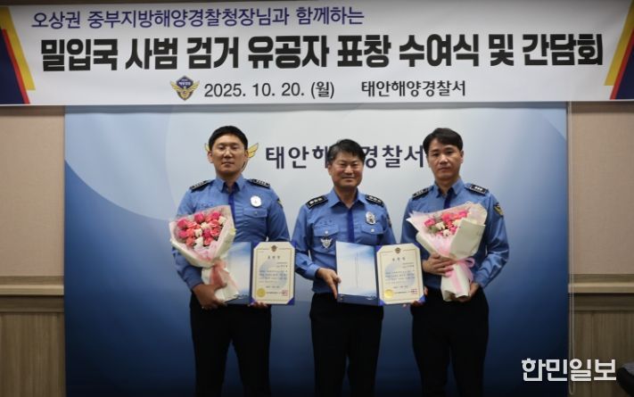 한민일보 서울포커스 최성훈 기자 | 중부지방해양경찰청은 지난 20일, 태안해경서 소회의실에서 최근 태안 해상에서 발생한 밀입국 사범 검거와 관련해 유공자 표창 수여 및 간담회를 개최했다고 밝혔다.